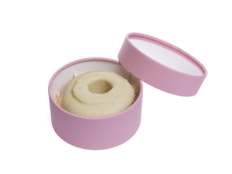 In der handgemachten roséfarbenen Runddose wird unser „kleiner weißer“ Baumkuchenring perfekt präsentiert.