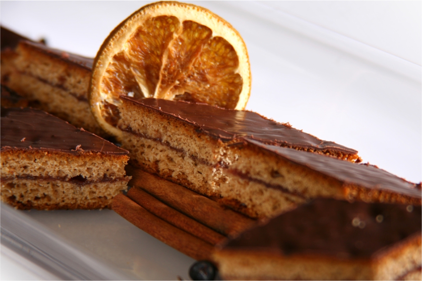 Feinster Honiglebkuchen, der vor dem Backen mit hausgemachter Rotfruchtkonfitüre gefüllt wird. Die Oberseite wird mit Zartbitterkuvertüre angepinselt und es werden in handwerklicher Schneidekunst Rauten geschnitten.