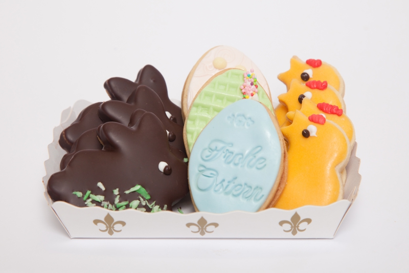 Unsere Oster-Teegebäckmischung besteht aus 4 Küken, 4 Hasen und 3 mit Nougat gefüllten Ei-Mürbeteigkeksen. Nicht nur ein Genuss für den Gaumen, auch eine Augenweide.